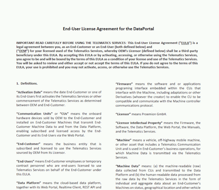 OEM DataPortal customers (top- or distributor-level) are required by law to inform users of their legal rights and obtain their consent in regards to data protection and privacy. The DataPortal hosts and enables access to the documentation via links, and user consent via banner.