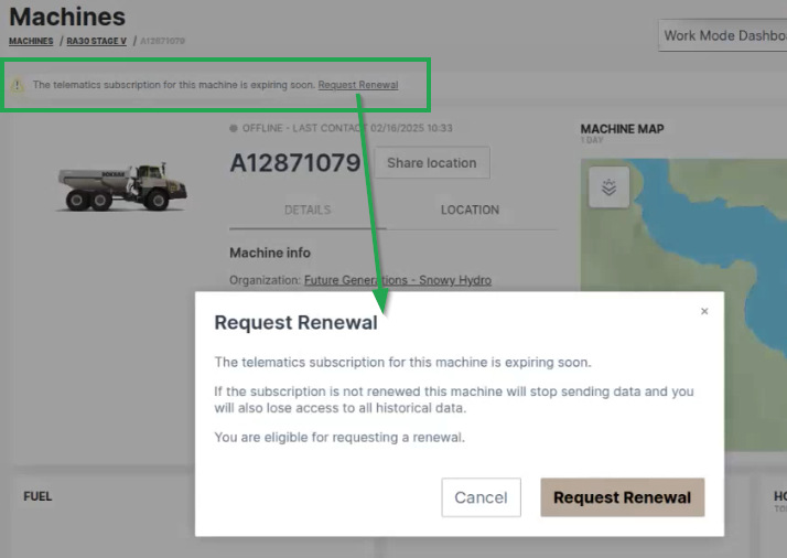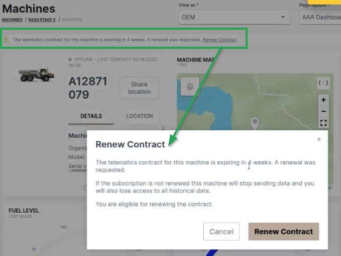 Contracts that are expiring soon are highlighted in the Machine Page within a banner on the top.