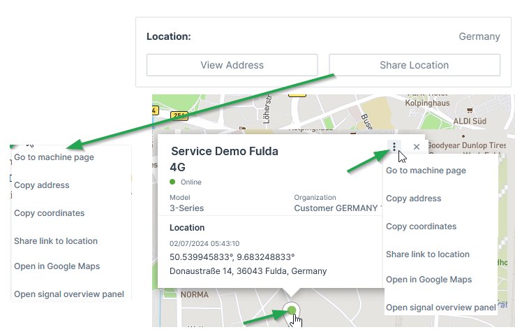The Location tab gives information about the machine's address and its Status and Update. Via the 3-dots you have options to copy and share the machine's location, see also Machines Overview.