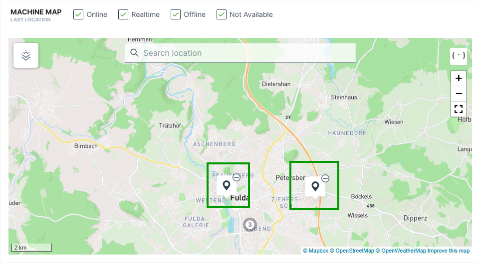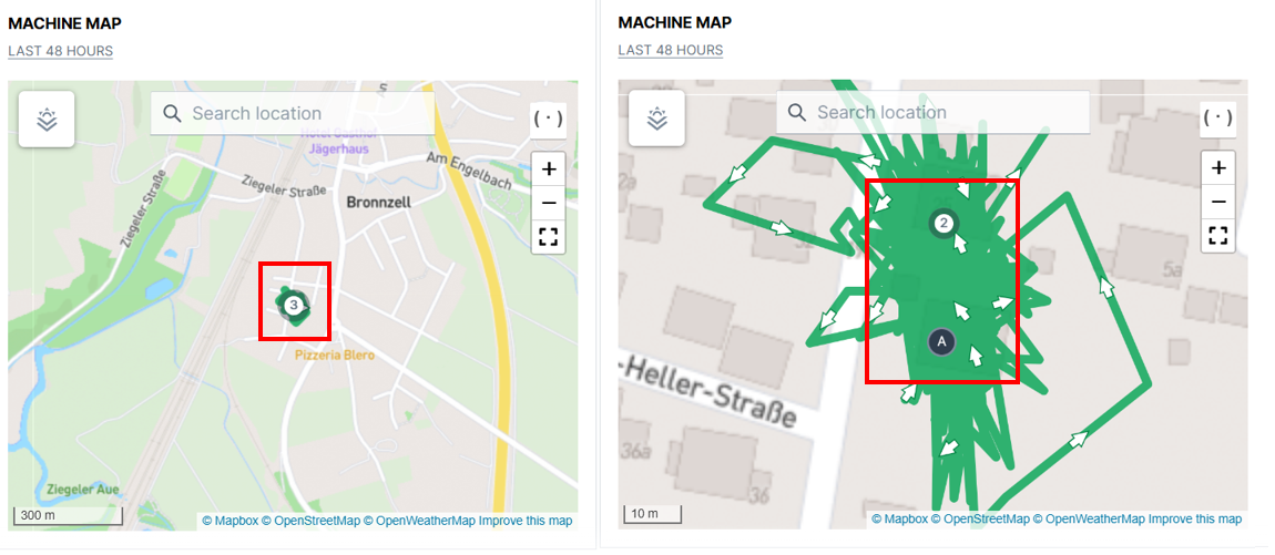 | 8 | Map | Displays the machine's location on a map. If the machine is offline, a drop icon with a minus sign indicates its last known position. ![]() If the machine is online, the endpoint of the current track (circle with the number 3) is displayed . When zooming in, both the starting point (circle with letter A) and the current location (circle with number 2) of the machine are displayed. ![]() |