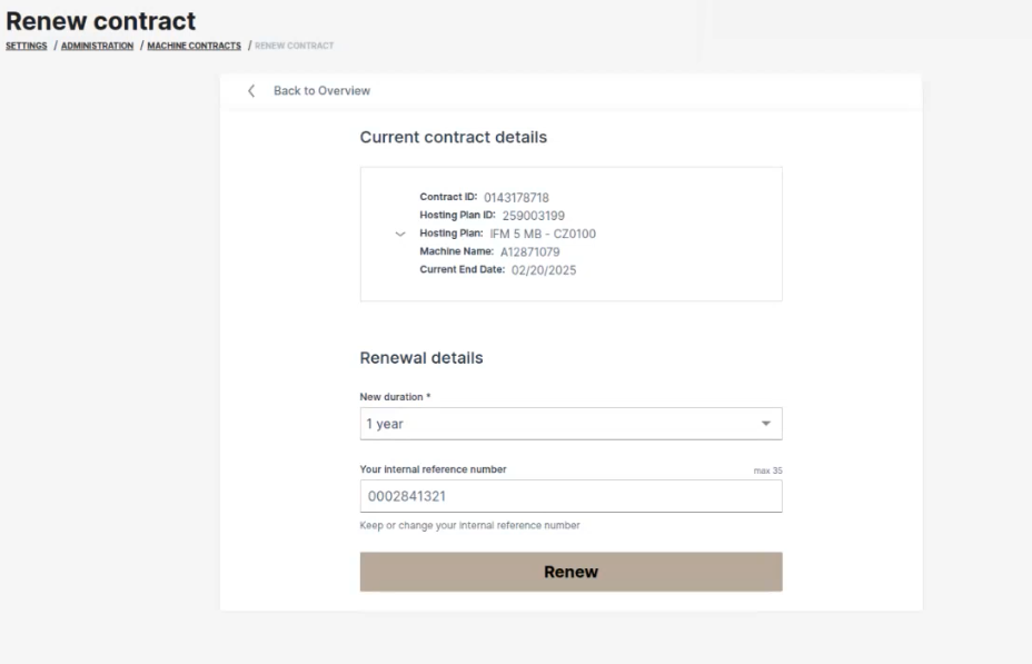 Clicking Renew Contract, you will be forwarded to the Machine Contracts menu, where you can configure and confirm the Renew process for the selected machine: