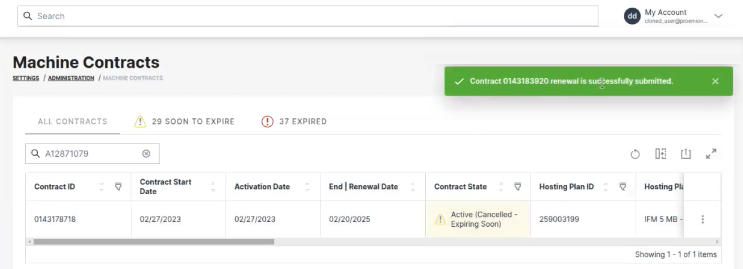 After successful renewal, a confirmation will be displayed in the Machine Contracts menu: