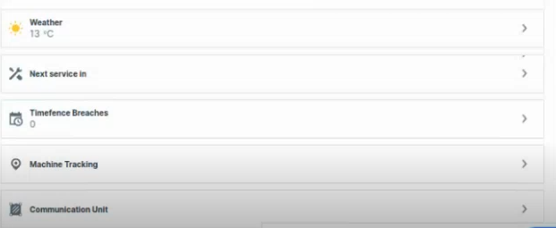 Shows the machine info and other details via icons for Maintenance Tasks, Machine Tracking and Weather Forecasts and Overlay when enabled in the Feature Switch. In the Details tab, the following information is displayed additionally to the configured ones: