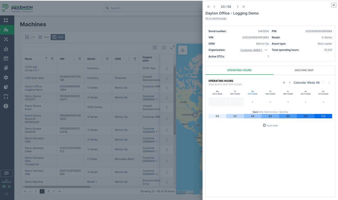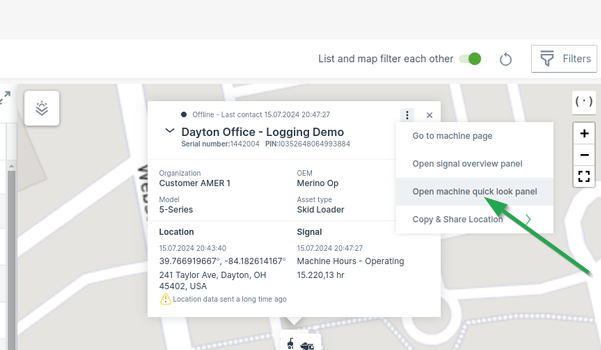The Machine Quick Look is an enhanced view in the sidebar on the most frequently requested signal reports and machine activities like operating hours and/or ignition state and also shows the machine properties.