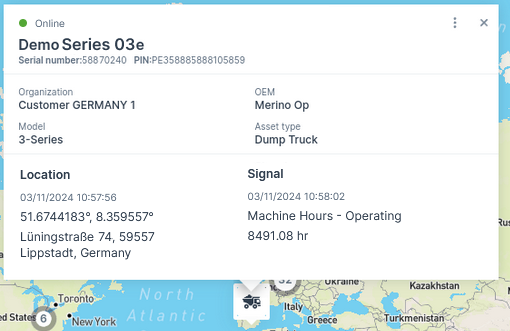Hovering over a machine on the map displays a pop-up with basic details for online and offline (showing "Last contact") machines: