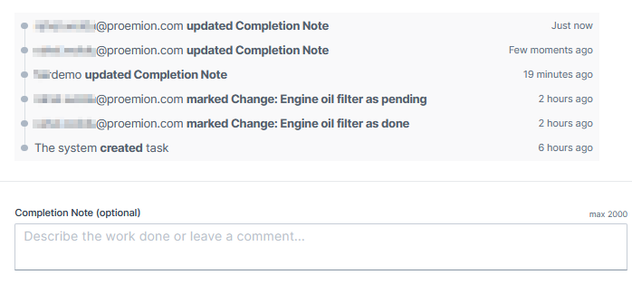 actions regarding Activities: "User xy marked Change: Engine oil filter as pending".