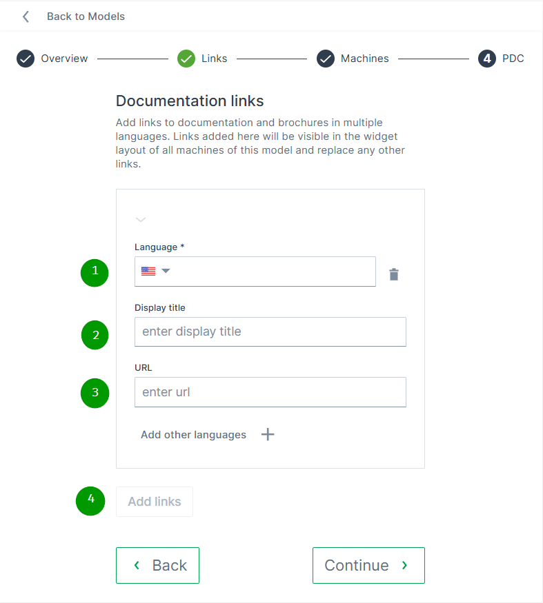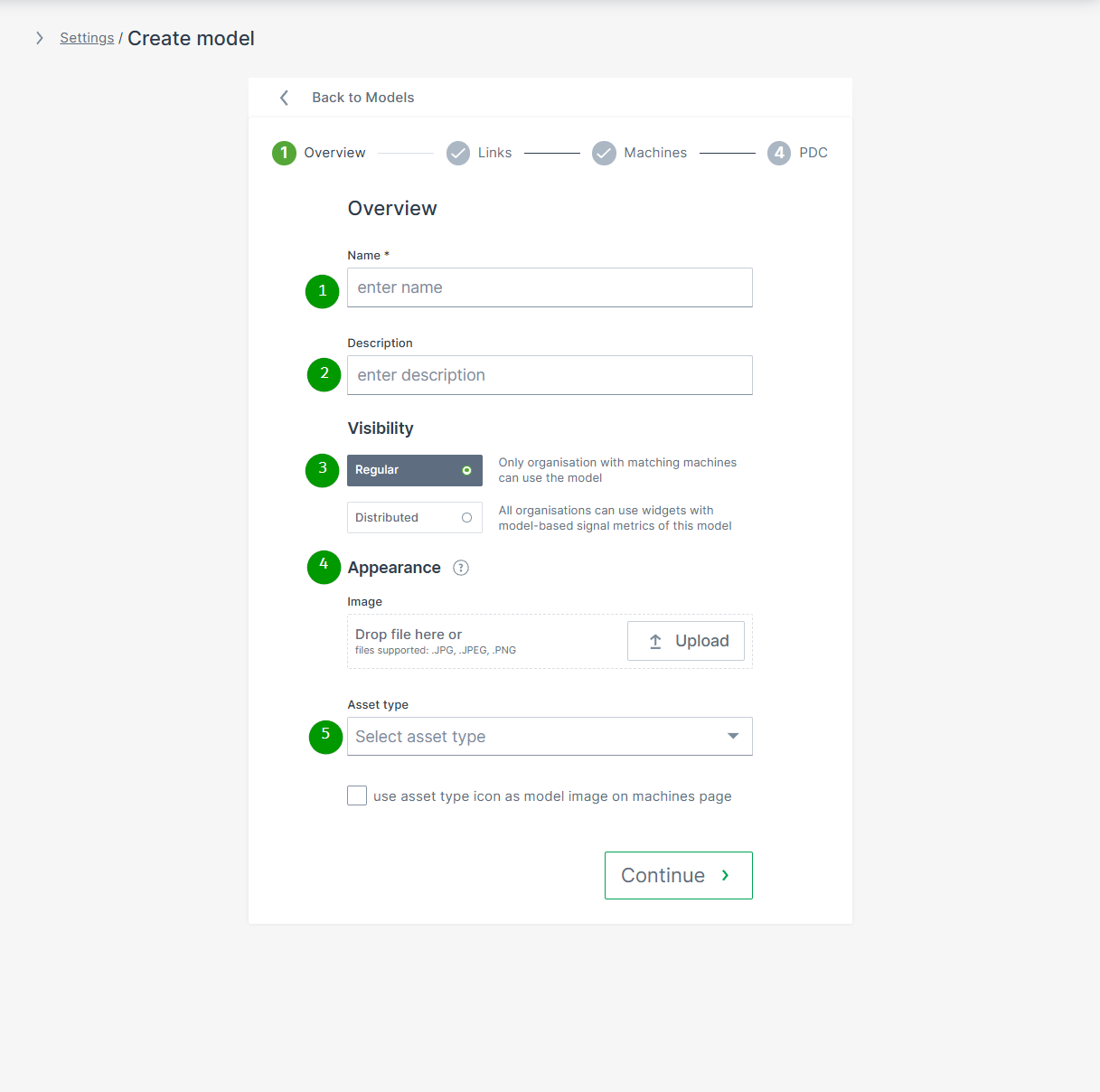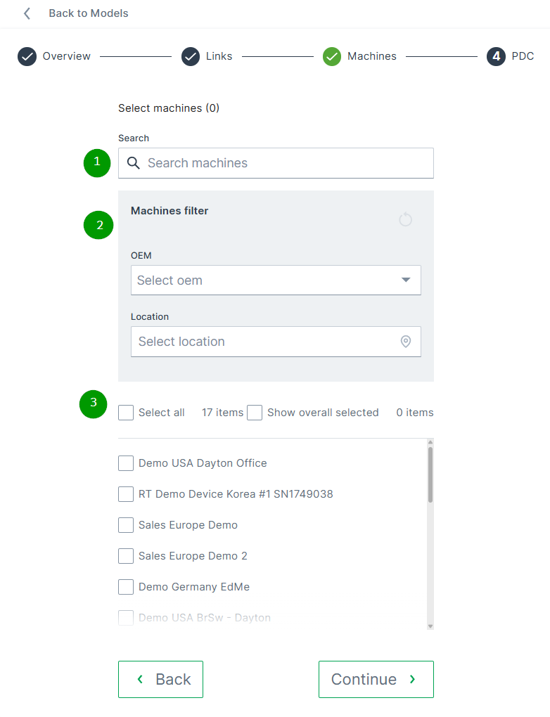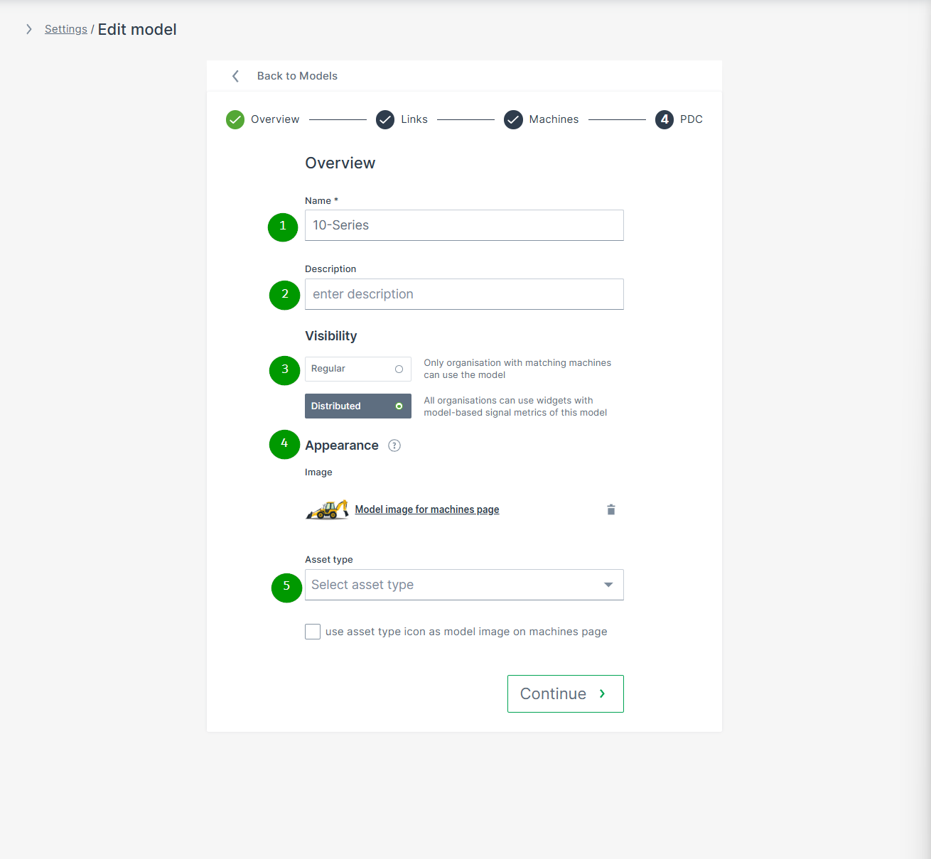 Click Continue to assign links, machines and PDCs to the created model.