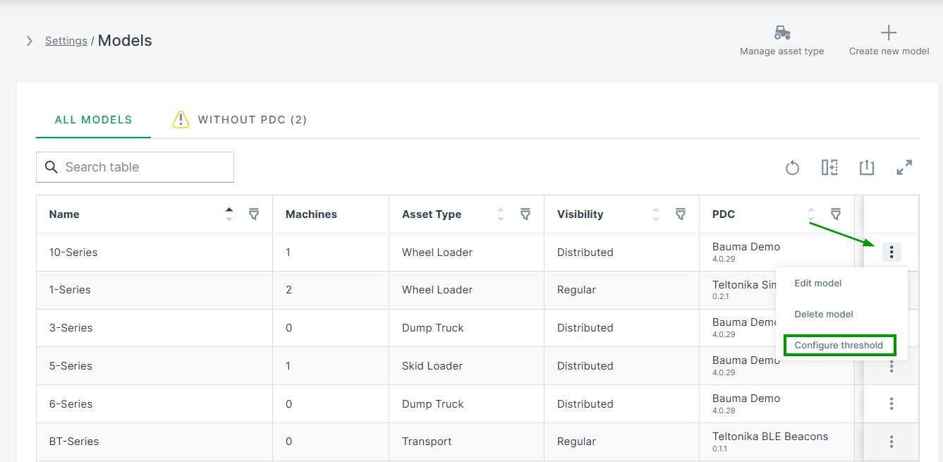 Thresholds are only available in the Models tab if the model and the user belong to the same organization. For each machine model, a set of thresholds can be configured per signal.