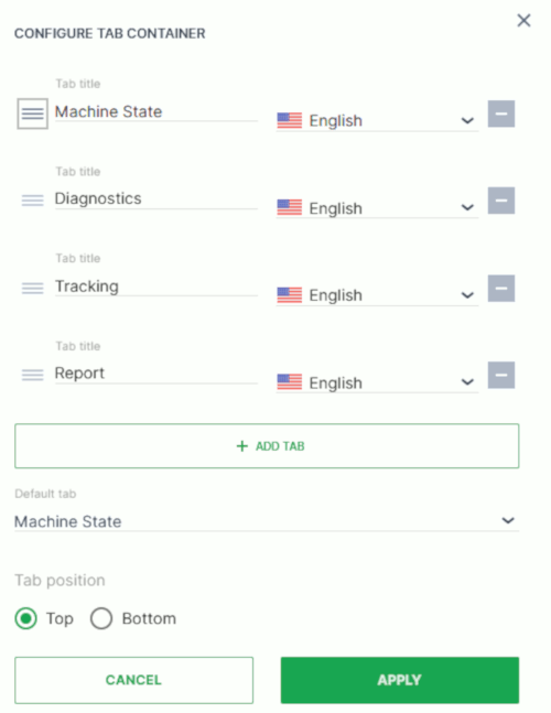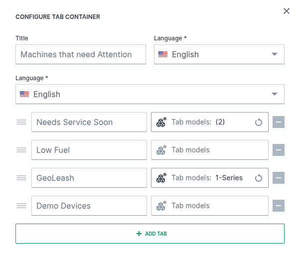 In Fleet Dashboards, tabs can optionally be bound to specific machine models, enabling users to see only relevant tabs and keeping dashboards clear even in mixed-model fleets.