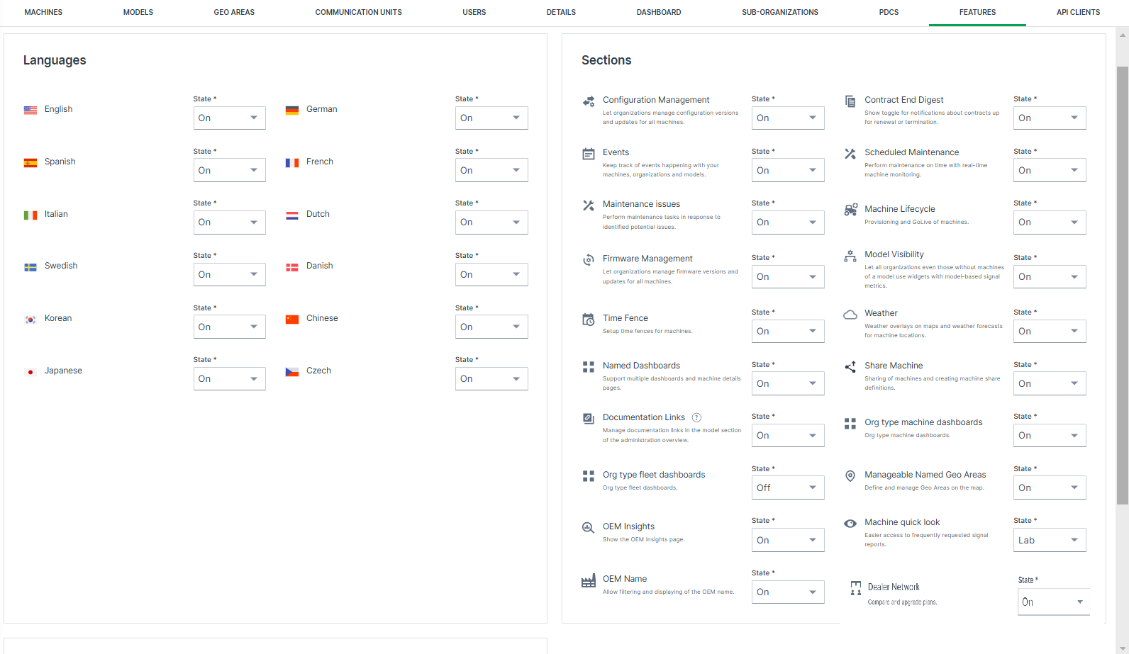 | OEM Name | Allows you to enable OEM name (display machine data, machines filter) globally for machines in your fleet. |