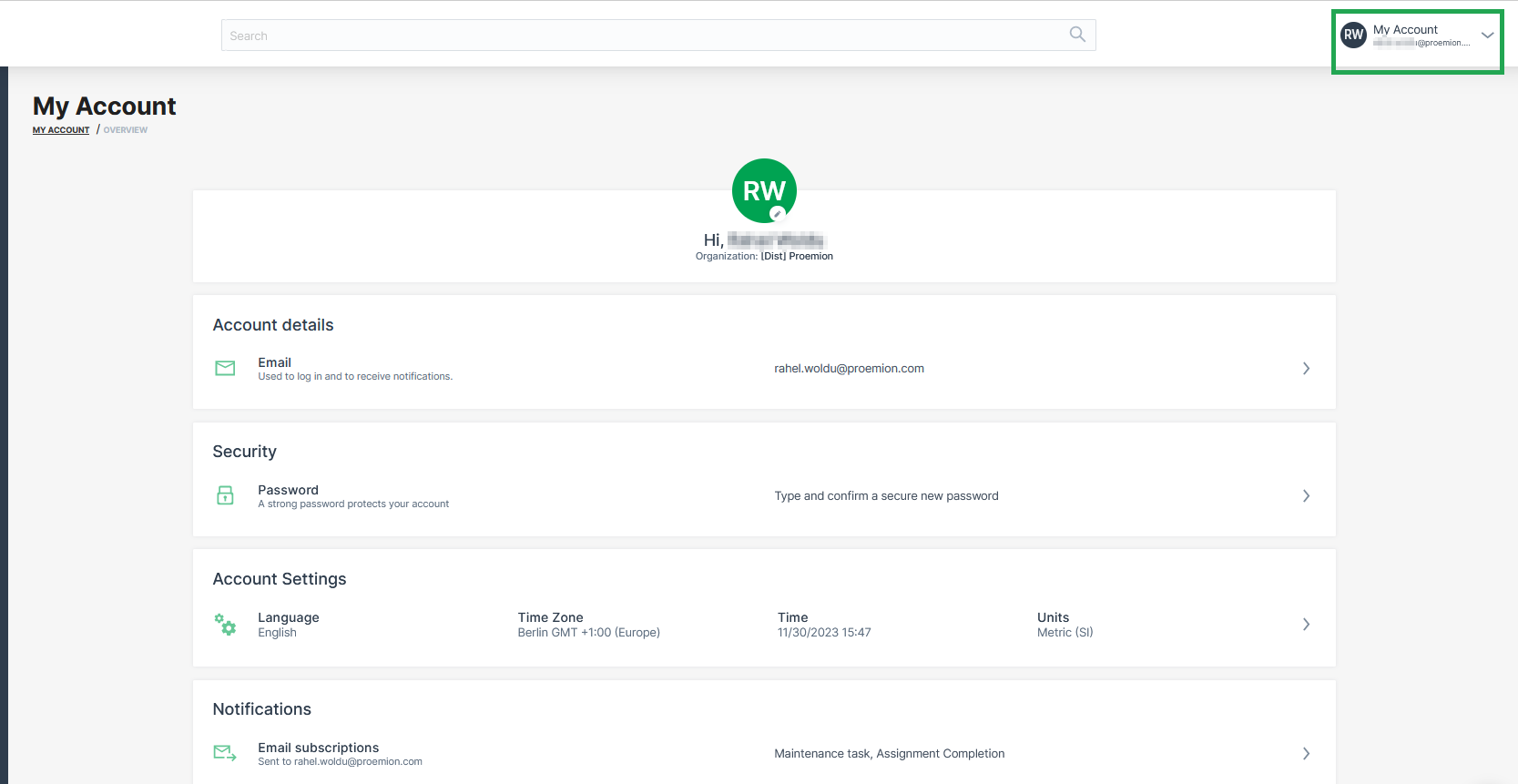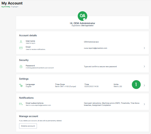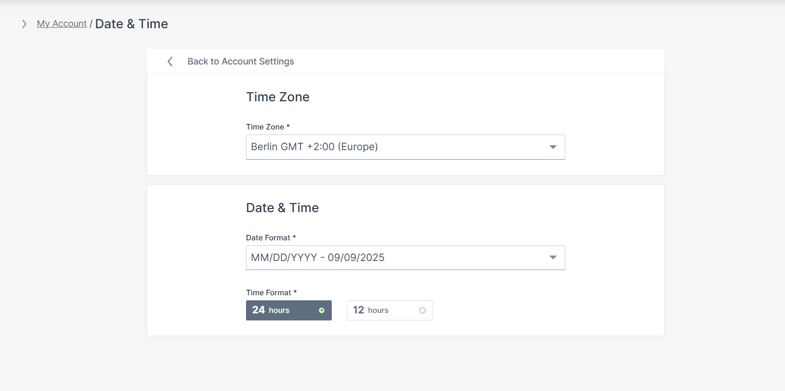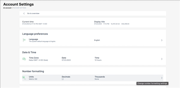 In the Account Settings menu, you can configure your time zone and date format preferences. All machine data displayed in the DataPortal uses the time zone set here. By default, this is your browser´s time zone.