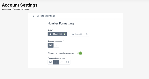 In the section numbers formatting, the unit system, the decimal separator and the thousand separator can be defined.