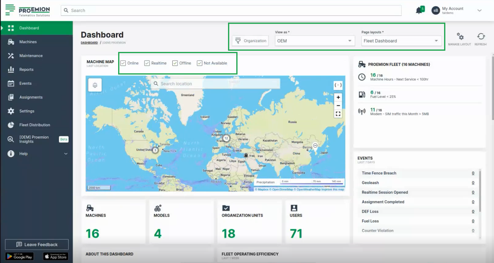 Since there are certain rules for displaying the several dashboards, it is essential to distinguish between organization associated dashboard and model associated dashboard. The basic idea of an organization associated dashboard is to show the most relevant parameters for the entire fleet and organization. The model associated dashboard is aimed to show machine and machine model specific data. Please be aware that the organization associated dashboard is bound to an organization and a model associated dashboard is bound to the organization type.