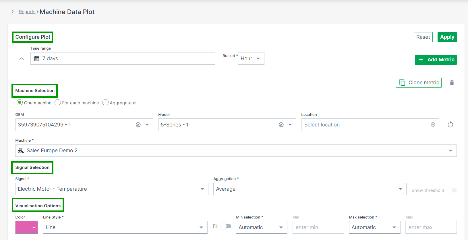 | Add / Clone Metric | Enables adding or duplicating metrics within the same report. • + ADD METRIC – Add another signal or machine. • Clone Metric – Duplicate an existing configuration to create a similar dataset. |
