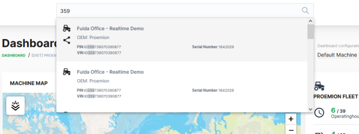 Selecting an entry from the results forwards you to the Machine Page for the communication unit.