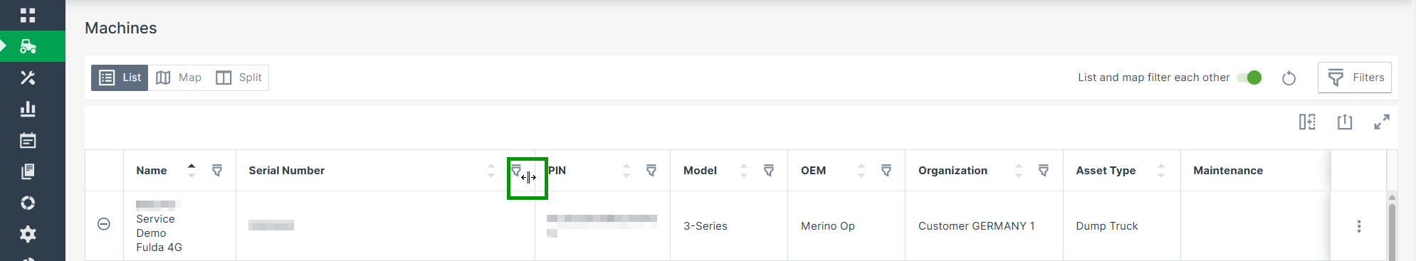 Columns can be resized by dragging the handle at the right edge of the column, which shows a double-headed arrow icon with two vertical lines in the middle, see screenshot below: