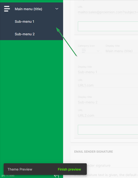 To create a preview of your custom menu entries, click Preview in the upper-right corner. The preview is shown in the same window and can be stopped by selecting Finish preview.
