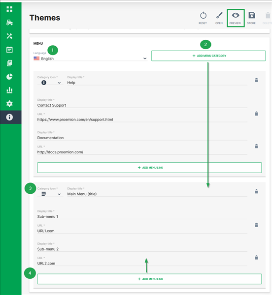 To add a menu category with menu links to your DataPortal menu, go to Themes > Menu section and proceed as follows: