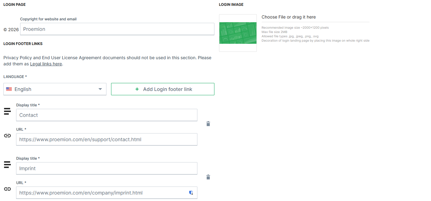 In this area the copyright notice, image and footer links for the Login Page are defined.