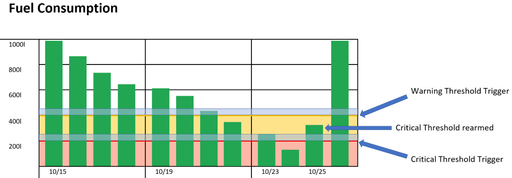 In the example, the red-shaded area represents a warning threshold. Once the threshold has been breached, a notification is included in the daily summary. The fuel level must be refilled filled past the blue-shaded area to rearm the trigger.